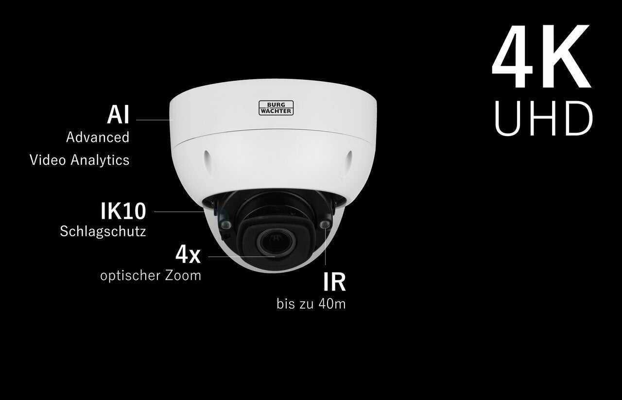 Die Kameras der BWNC-842-E Serie, sind hochleistungsfähige AI Kameras. Dank der neuen BURGaiva Video Analyse können diese Objekte unterscheiden und Objektmerkmale erfassen. Ferner verfügen diese über ein ePoE Modul, mit dem eine Netzwerkübertragung von bis zu 800m erreicht wird. Zudem kann mittels H.265 (+) Codec, die benötigte Bandbreite, bei gleicher Bildqualität, nahezu halbiert werden. Dank der AI Video Analyse und Kennzeichenerknnung kann die Kamera universell für Überwachungsaufgaben, in Bereichen wie Retail, Objektüberwachung,Produktionsüberwachung, etc. eingesetzt werden. Die leistungsstarke Hardware wurde mit einem neuen 8MP Bildsensor für brillante Farben auch bei geringen Lichtverhältnissen, einem schnellen DSP und mehr Arbeitsspeicher ausgestattet.