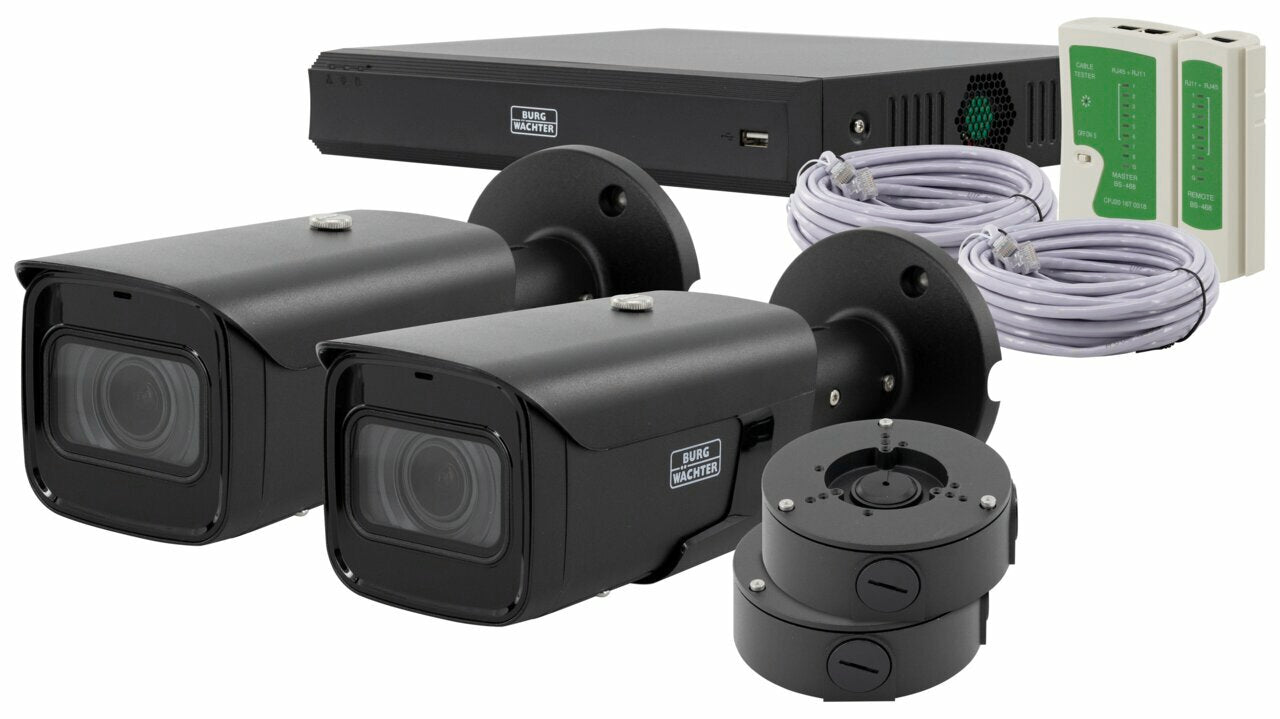 Das Netzwerktechnik Starter Set besteht aus einem 8 Kanal Netzwerk-Rekorder und zwei Kameras für den Innen- und Außenbereich. Die Kameras können z.B. mit vorkonfektionierten Kabeln mit dem internen PoE Switch des Rekorders verbunden werden. Der Rekorder bindet die Kameras automatisch per Plug & Play in das System ein. Dies vereinfacht die Inbetriebnahme und ermöglicht kostengünstige Installationen. Die ausgefeilten Vorkonfigurationen machen eine umfangreiche Kamerakonfiguration überflüssig. Für die Erweiterung des Systems stehen 6 freie Kanäle zur Verfügung.